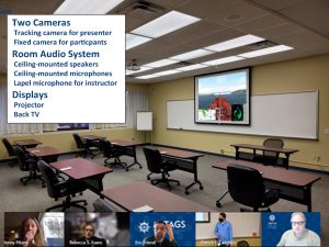 The instructor is able to view and interact with remote participants on a monitor on the back bulkhead of the classroom, while the remote participants can see and hear the instructor as they are tracked in the classroom as well as the onsite attendees plus the presentation.